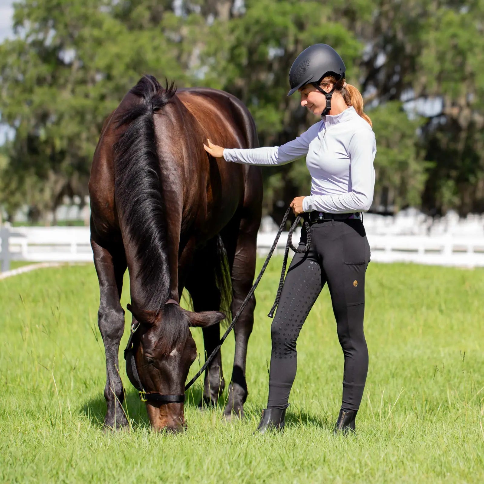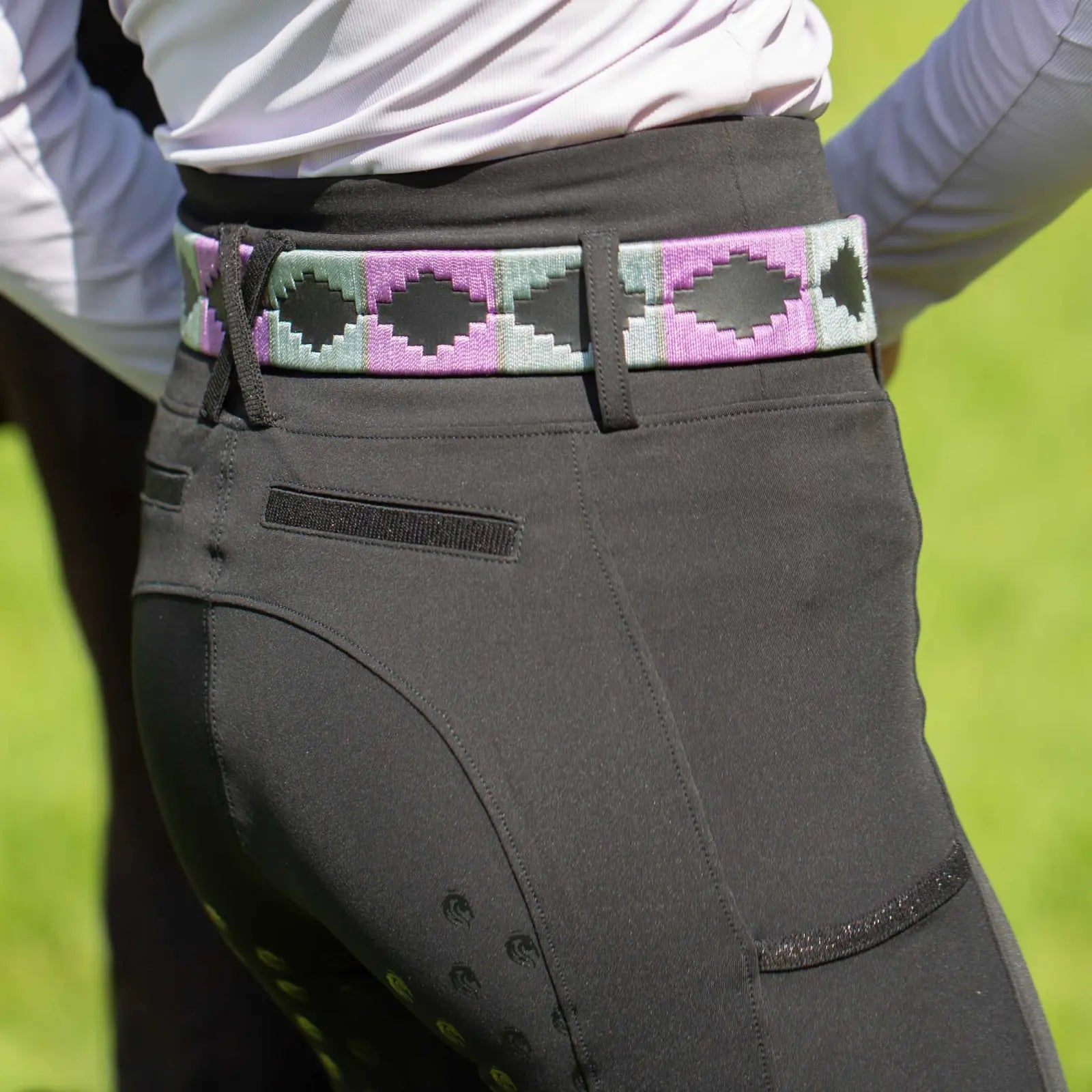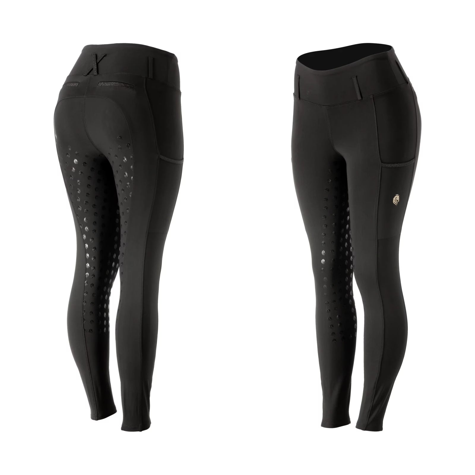 The Equinavia Mia Women’s Full Grip Tights offer a lightweight, mid-high rise design. Crafted from the same high-performance fabric as the popular Maja tights, they provide exceptional stretch and breathability while being supportive and firming. The high waistband features offset belt loops for a secure and flattering fit, while two deep side pockets and faux back pockets are accented with shimmery tape for a touch of elegance. A 3/4 silicone seat ensures optimal grip across disciplines, and gripper bottoms keep the tights securely in place for all-day comfort in the saddle.